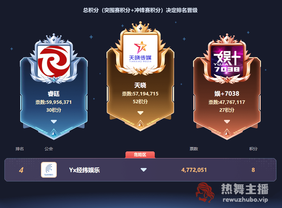 依托旗下强大的电母矩阵和极具诱惑力的奖励机制,睿廷始终紧咬比分,展现了作为头部主流公会的强大实力与韧性。