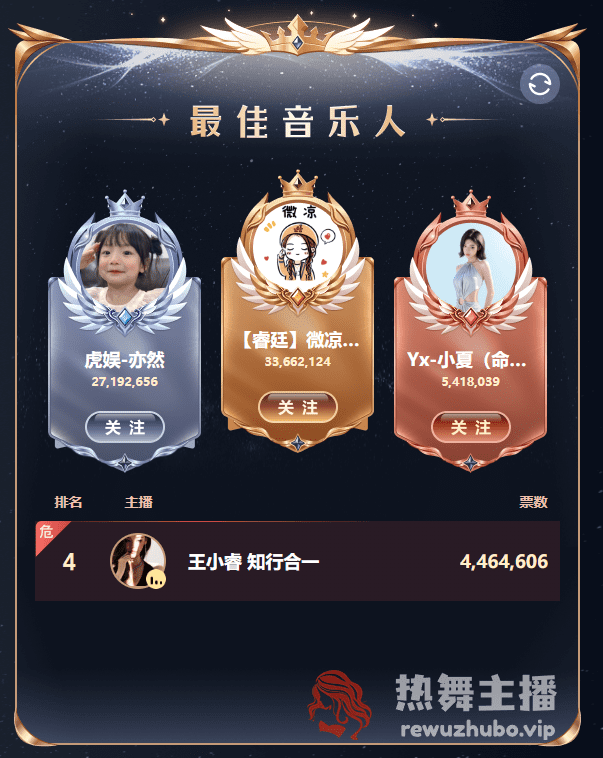 最终,睿廷-微凉以3366万票的超高票数拿下冠军,用实力证明了老牌电母的底蕴,而虎娱-亦然同样也是以2719万票位居亚军。