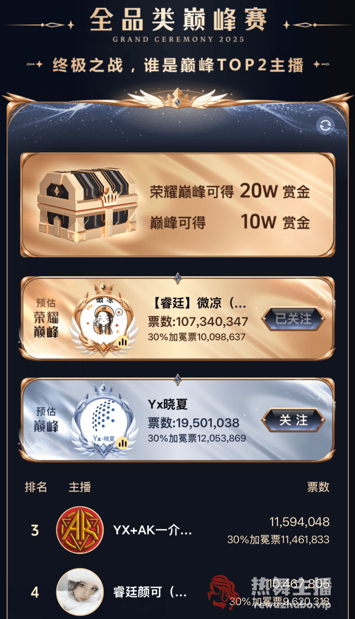 而预估成为“巅峰”主播的晓夏仍旧是有风险,第三名的AK与第四名的睿廷颜可也是有机会的。
